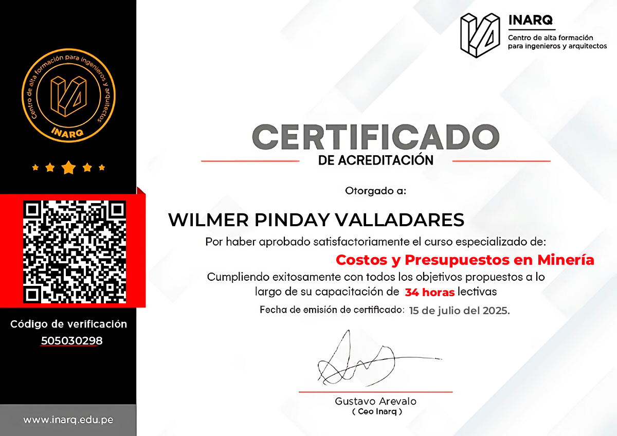 por haber finalizado satisfactoriamente el curso Costos y Presupuestos en Minería completando 34 académicas.